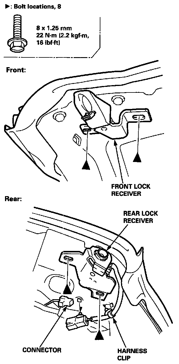3. Disconnect the connector, and detach the harness clip (rear lock receiver). Remove the bolts, then remove the front end rear lock receivers.
