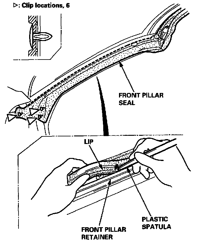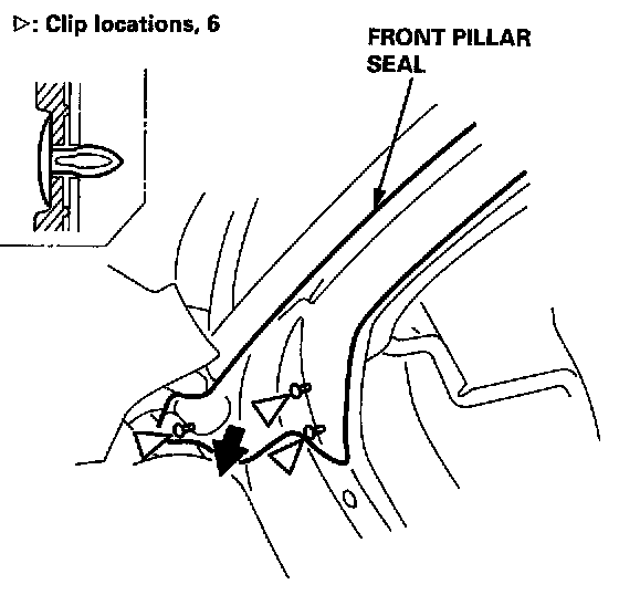 16. Install each pillar, portion of the front pillar seal into the front pillar retainer as shown, then attach the clips.