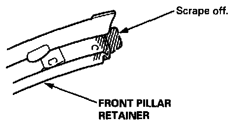 9. If the old front pillar retainer is to be reinstalled, use a putty knife to scrape off all of the old sealant and the EPT sealer as shown, then clean the front pillar retainer surface with alcohol where new sealant and EPT sealer are to be applied.