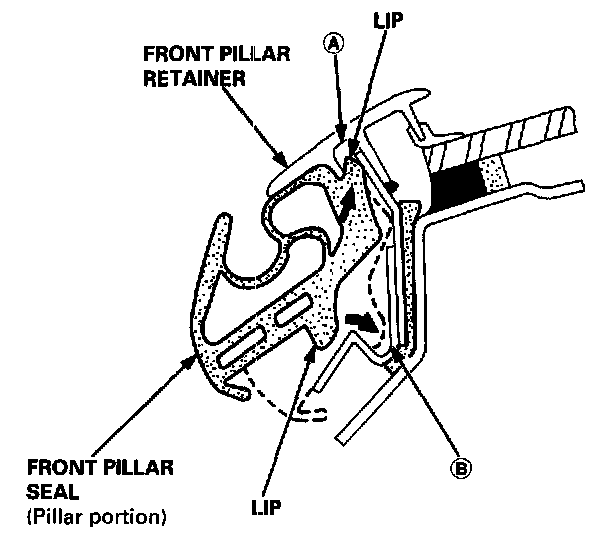 - After setting the lip at location (A), install the front pillar seal while pushing the lip in the front pillar retainer with a rounded plastic spatula at location (B).