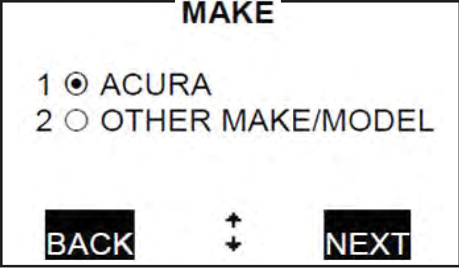 10. Select Acura for the vehicle being tested, and press NEXT to continue.