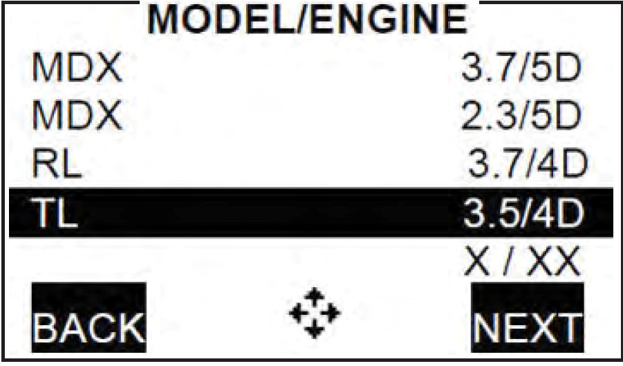 11. Scroll through the list and select the Acura MODEL/ENGINE you are testing, and press NEXT to continue.