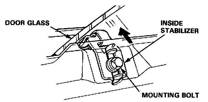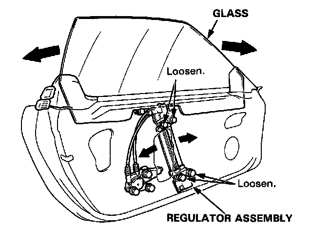 b. Loosen the bolts securing the regulator assembly, and move the regulator assembly fore or aft to align the glass with the body at the front and center pillars.