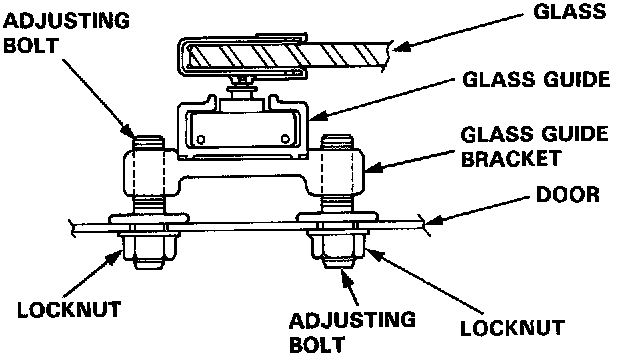 NOTE: Turn the front and rear adjusting bolts the same amount so as to keep the glass guide bracket parallel with the seating surface of the door. After tightening the adjusting bolts, make sure that the ends of the adjusting bolts still project out of the locknuts.