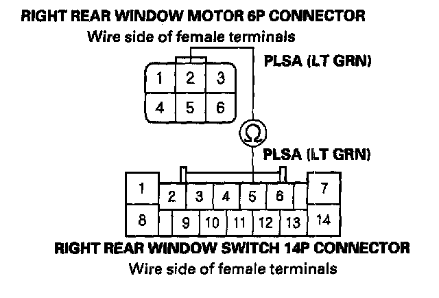 10. Check for continuity between right rear window switch 14P connector terminal No. 5 and right rear window motor 6P connector terminal No. 2.