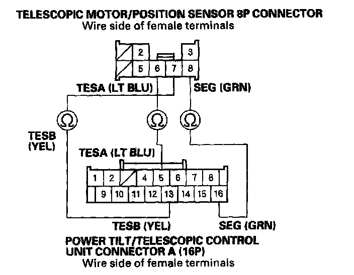 12. Check for continuity between power tilt/telescopic control unit connector A (16P) terminals No. 5, No. 13, and No. 16 and telescopic motor/position sensor 8P connector terminals No. 6, No. 7, and No. 8 respectively.