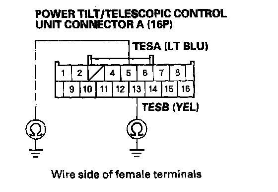 13. Check for continuity between body ground and power tilt/telescopic control unit connector A (16P) terminals No. 5 and No. 13 individually.