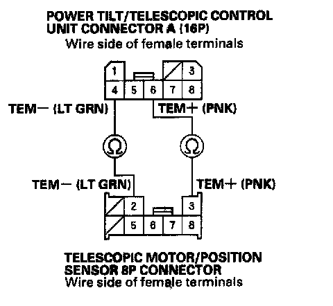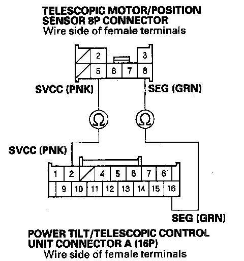 20. Check for continuity between power tilt/telescopic control unit connector A (16P) terminals No. 2 and No. 16 and telescopic motor/position sensor 8P connector terminals No. 5 and No. 8 respectively.