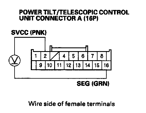 25. Measure voltage between power tilt/telescopic control unit connector A (16P) terminals No. 2 and No. 16.