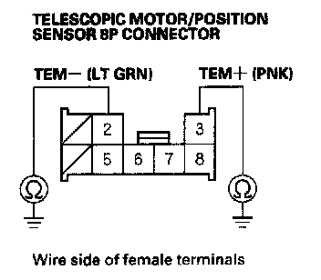 30. Check for continuity between body ground and telescopic motor/position sensor 8P connector terminals No. 2 and No. 3 individually.