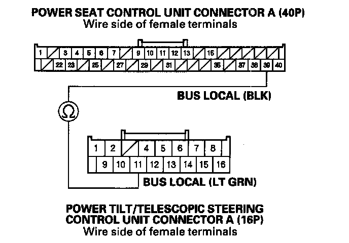 8. Check for continuity between power seat control unit connector A (40P) terminal No. 39 and power tilt/telescopic control unit connector A (16P) terminal No. 11.