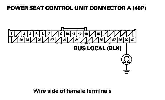 9. Check for continuity between power seat control unit connector A (40P) terminal No. 39 and body ground.