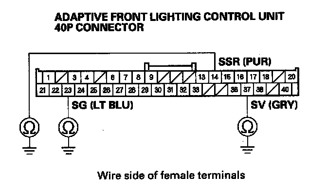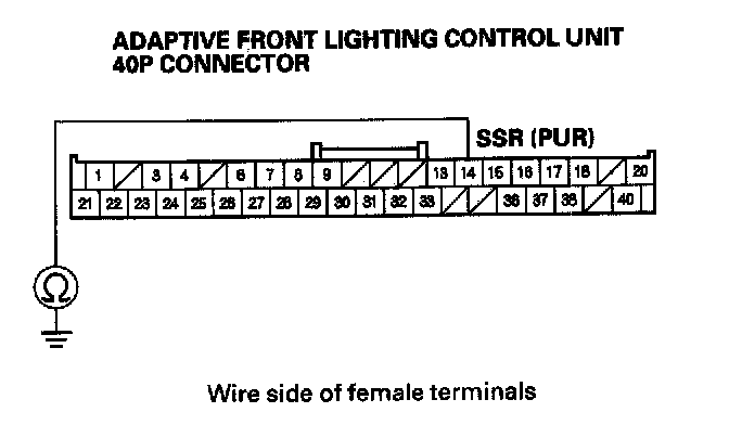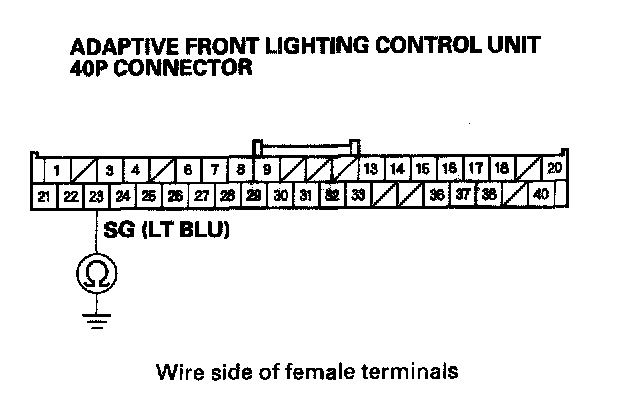 14. Check for continuity between adaptive front lighting control unit 40P connector terminal No. 23 and body ground.