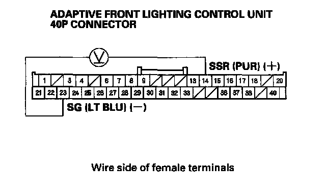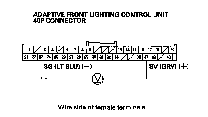21. Measure voltage between adaptive front lighting control unit 40P connector terminals No. 14 (+) and No. 23 (-).