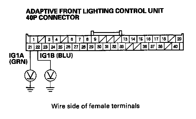 22. Measure voltage between body ground and adaptive front lighting control unit 40P connector terminals No. 21 and No. 22 individually.