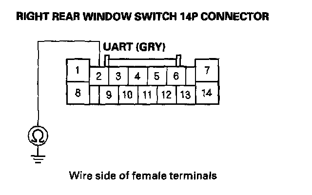 9. Check for continuity between right rear window switch 14P connector terminal No. 2 and body ground.
