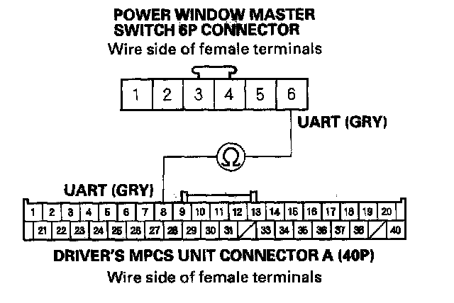 12. Check for continuity between driver's MPCS unit connector A (40P) terminal No. 8 and power window master switch 6P connector terminal No. 6.