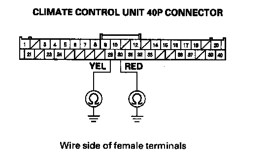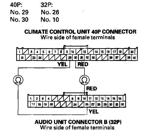 7. Check for continuity between the given terminals of the climate control unit 40P Connector and audio unit connector B (32P).