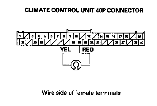 9. Check for continuity between the No. 29 and No. 30 terminals of the climate control unit 40P connector.