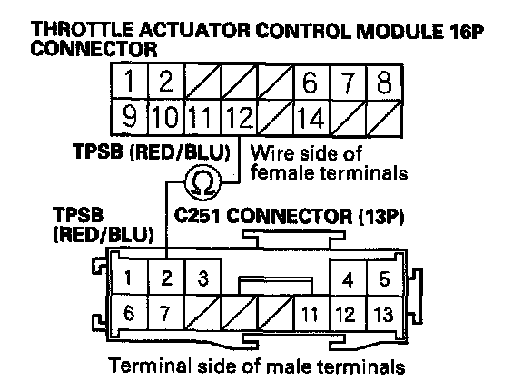 12. Check for continuity between throttle actuator control module 16P connector terminal No. 12 and C251 connector (13P) terminal No. 2.