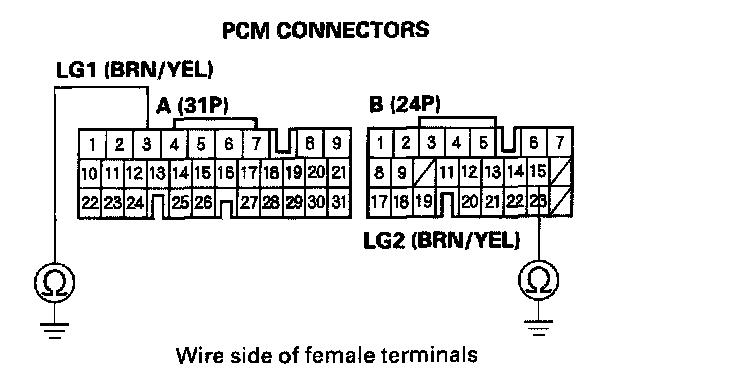 9. Check for continuity between PCM connector terminals A3 and body ground, and betweenB15 and body ground.