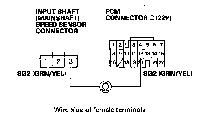 17. Check for continuity between PCM connector terminal C12 and input shaft (mainshaft) speed sensor connector terminal No. 3.