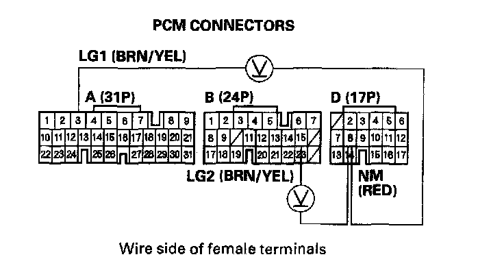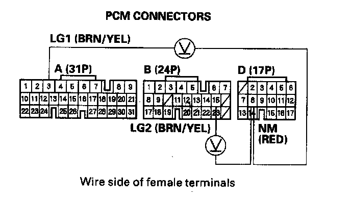24. With the engine idling, measure the voltage between PCM connector terminals D8 and A3 or B15.
