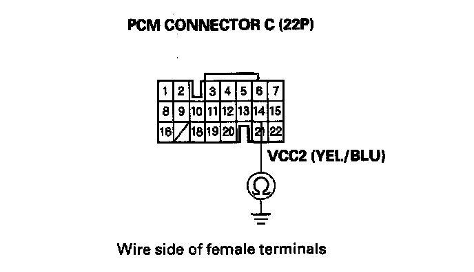 22. Measure the voltage between PCM connector terminals D8 and A3 or B15.
