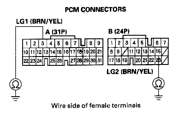 8. Check for continuity between PCM connector terminals A3 and body ground, and between B15 and body ground.
