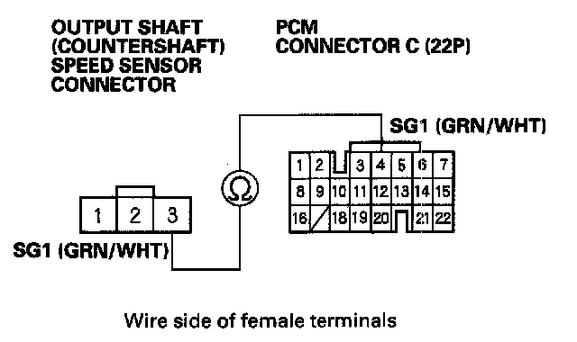 16. Check for continuity between PCM connector terminal C4 and output shaft (countershaft) speed sensor connector terminal No. 3.
