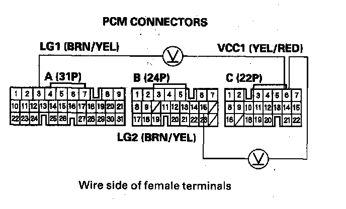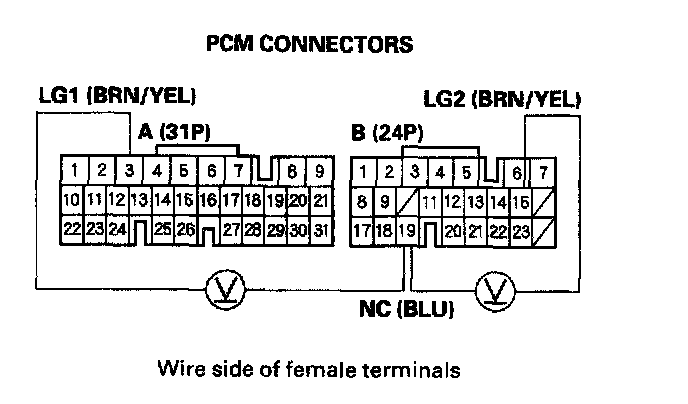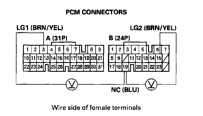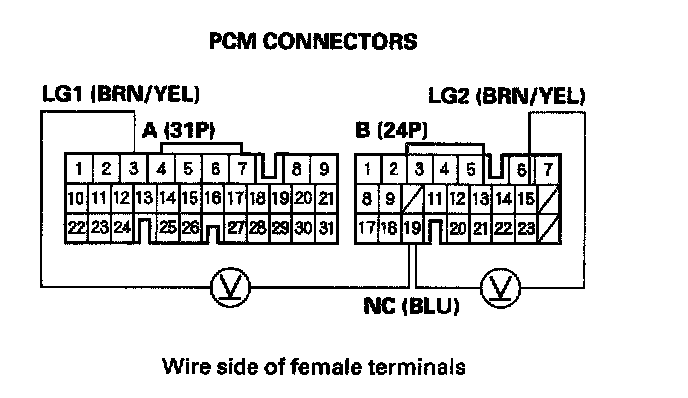 24. Measure the voltage between PCM connector terminals B19 and A3 or B15.