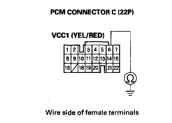 NO - Check for loose or poor connections at PCM connector terminal C14. If the connection is OK, update the PCM if it does not have the latest software, or substitute a known-good PCM, then recheck. If the symptom/indication goes away with a known-good PCM, replace the original PCM.