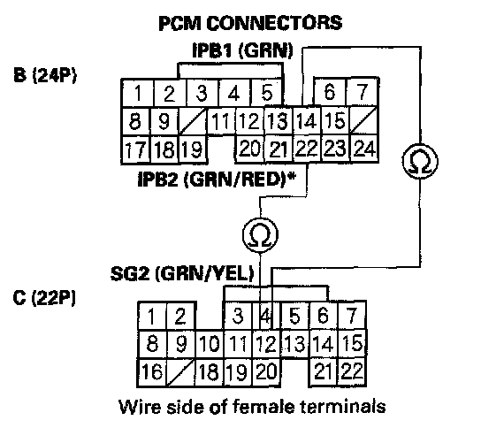 9. Check for continuity between PCM connector terminals B14 (B22)* and C12.