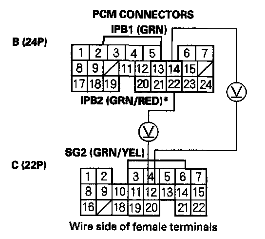 12. Measure voltage between PCM connector terminals B14 (B22)* and C12.