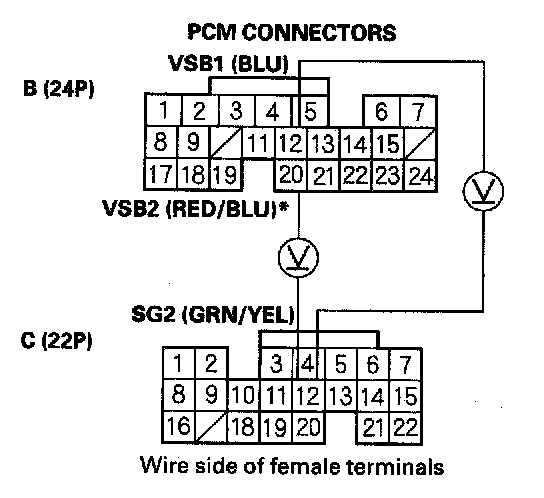 13. Measure voltage between PCM connector terminals B12 (B20)* and C12.