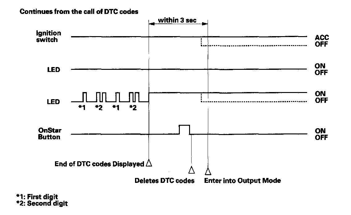 The OnStar system will delete all the DTCs when the OnStar button is pressed (for less than 2 seconds) within 3 seconds after the DTCs are finished being displayed. The system will then exit the DTC delete mode and enter the self-diagnostic mode.