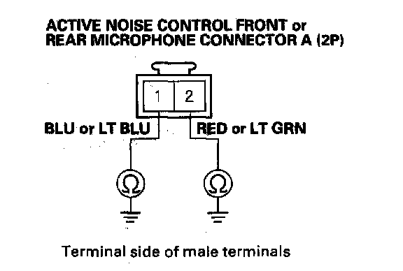 16. Check for continuity between body ground and active noise control front and rear microphone connector A (2P) No. 1 and No. 2 terminals individually.