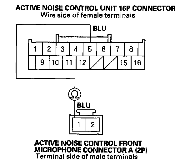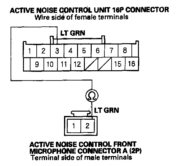 NO - Repair an open in the wire between the active noise control unit 16P connector No. 3 terminal and active noise control front microphone connector A (2P) No. 2 terminal.