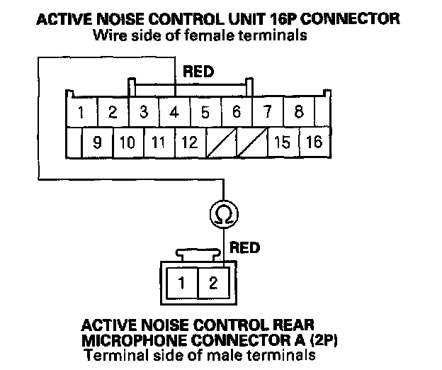 NO - Repair an open in the wire between the active noise control unit 16P connector No. 4 terminal and active noise control front microphone connector A (2P) terminal No. 2.