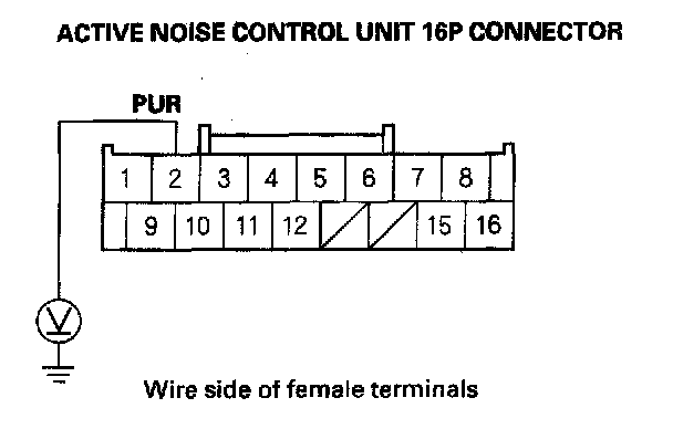 35. Check for voltage between the active noise control unit 16P connector No. 12 terminal and body ground.