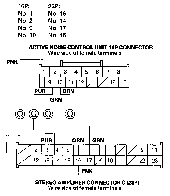 45. Check for continuity between the active noise control unit 16P connector and stereo amplifier connector C (23P).