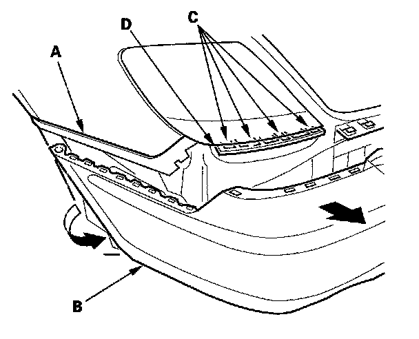 3. With the help of an assistant, pull the wheel arch portion away from the side spacer (A), while pulling the rear bumper (B) to release the bumper from the hooks C) on the side bracket (D).