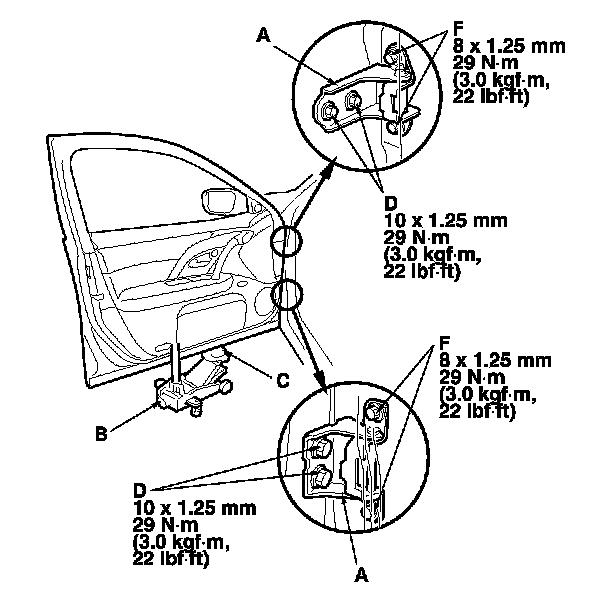- On the front door: Remove the front inner fender and the front fender fairing. Loosen the hinge mounting bolts (D) slightly, and move the door backward or forward.