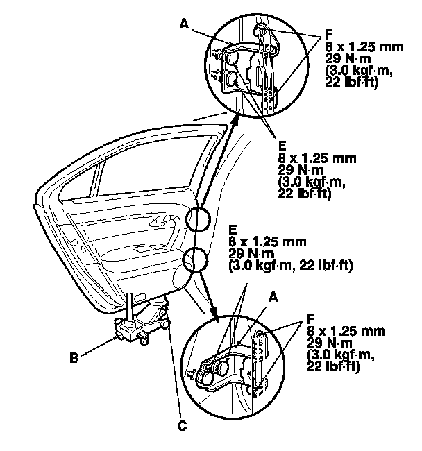 - On the rear door: Remove the B-pillar lower trim and remove the front seat belt and the retractor, and the plug seal from the body. Loosen the hinge mounting nuts (E) slightly, and move the door backward or forward, up or down as necessary to equalize the gaps.