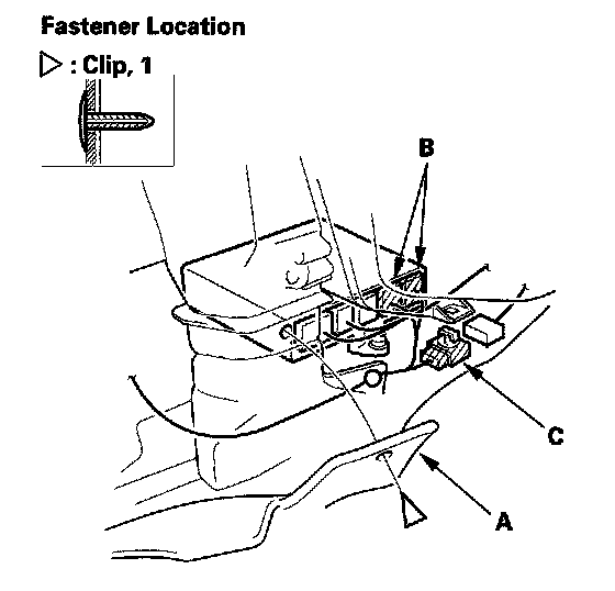 7. From under the dash, release the clip, and pull the carpet (A) back. Disconnect and detach the PCM connectors (B), engine wire harness connector (C).