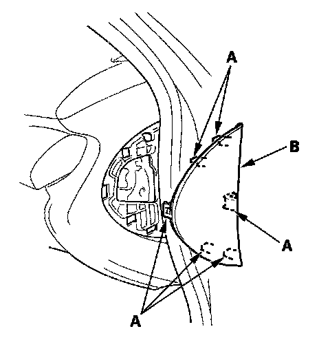 10. Open the passenger's door, and gently pull out along the rear edge to release the hooks (A), then remove the passenger's dashboard side lid (B).