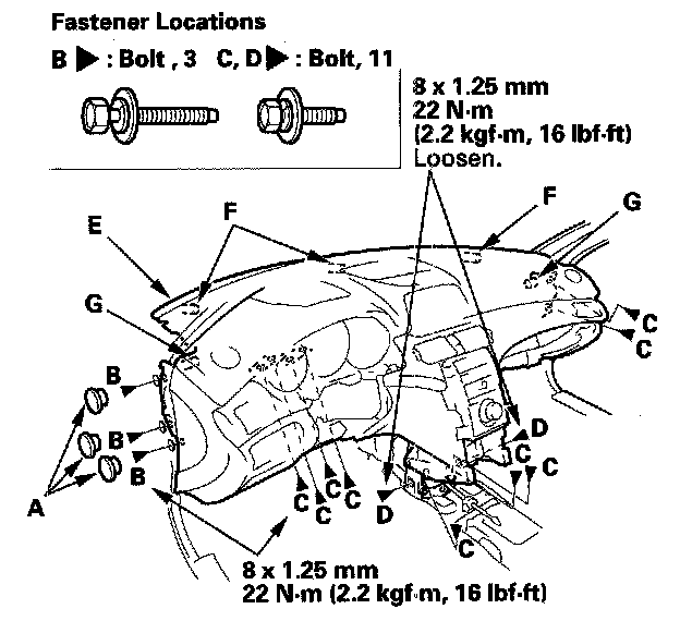 11. Open the driver's door, and remove the caps (A), then remove the bolts (B, C), loosen two bolts (D), and lift up on the dashboard (E) to release it from the guide pins (F, G).