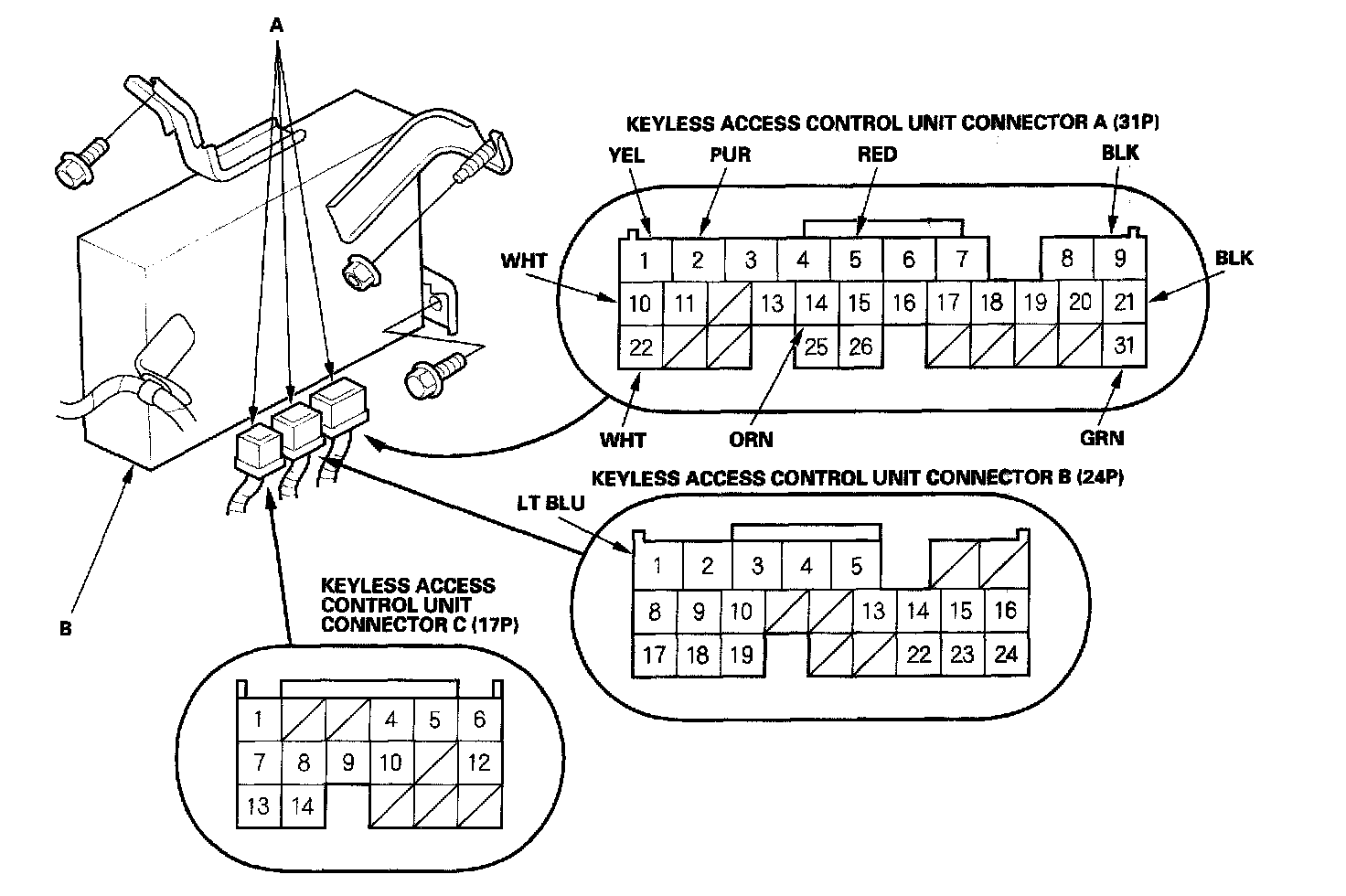 3. Disconnect the connectors (A) from the keyless access control unit (B).