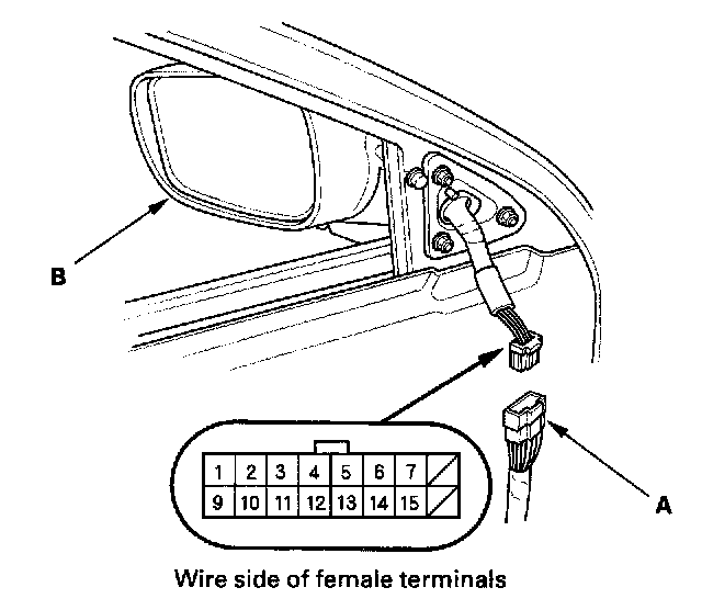 2. Disconnect the 16P connector (A) from the power mirror actuator (B).
