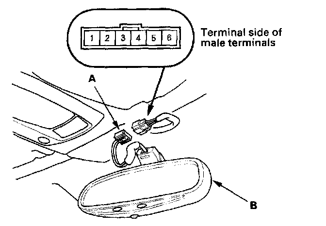 2. Disconnect the 6P connector (A) from the automatic dimming inside mirror (B).